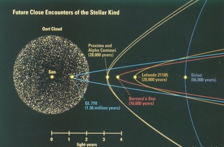 Представьте ночное небо, где привычные созвездия меркнут перед ослепительным новым светилом, которое ярче Сириуса в несколько раз. Это не фантастика, а наше будущее через 1,29 миллиона лет. К Солнечной системе мчится звезда GJ 710 — тихий оранжевый карлик, чья судьба неожиданно переплетётся с нашей. GJ 710 — неприметный житель космоса в 62 световых годах от нас. Она вдвое легче Солнца, почти на половину меньше в диаметре и греет куда скромнее — её температура около 4000 °C. Но у этой скромницы есть особенность: она целенаправленно движется прямо к нам. Каждую секунду расстояние сокращается на 14,5 километра. Расчёты показывают, что через миллион с лишним лет она пройдёт через окраины Солнечной системы, в районе гипотетического облака Оорта — ледяной сферы из триллионов кометных ядер, окружающей наше Солнце. В момент максимального сближения (примерно 10 000 астрономических единиц от Солнца) GJ 710 станет ярчайшим объектом в ночном небе после Луны. Но её главное воздействие будет не в с