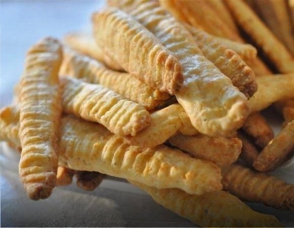 Отрываем небольшие кусочки теста и формируем длинные тонкие полоски. Каждую половинку разрезаем вдоль ножом и делаем узорный рисунок вилкой. Выкладываем палочки на подготовленные противни.