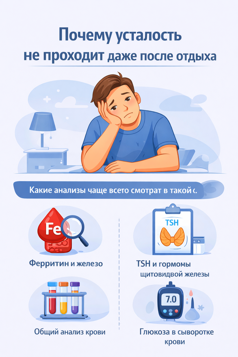 Знакомая ситуация: выходные прошли, отпуск был, сон вроде бы нормальный - а ощущение усталости никуда не делось. Более того, иногда после отдыха становится даже хуже: вялость, "туман" в голове, отсутствие мотивации, чувство, что организм не включается. В такие моменты многие начинают думать о лени, выгорании или возрасте. Но очень часто причина не психологическая, а физиологическая. Хроническая усталость - это не просто отсутствие энергии. Это сигнал, что в организме нарушен баланс: не хватает ресурсов, есть скрытые дефициты или системы работают на износ. И отдых в такой ситуации не восстанавливает, потому что телу нечем восстанавливаться. Организм может "выключать" энергию по разным причинам. Самые частые - дефициты микроэлементов, гормональные сбои, скрытые воспалительные процессы, проблемы с усвоением питательных веществ. При этом внешне человек может выглядеть нормально, а базовые анализы - быть "в пределах нормы". Особенность такой усталости в том, что она постоянная. Она не завис
