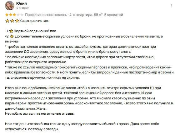 Найдутся те, кто недоволен. Есть у нас большая квартира на Козленской улице в Вологде. Она на первом этаже. И я согласен с гостем - там зимой холодно. Но мы привезли туда обогреватели. Что смогли, то сделали. А вот по остальным моментам я полностью с гостем не соглашусь. Это все ее извращенная интерпретация. Если взять все остальные 800 отзывов на Авито Путешествия про нашу компанию и квартиры, угадайте, что отмечает каждый гость. Скорость и простоту заселения. Карл! С-К-О-Р-О-С-Т-Ь и П-Р-О-С-Т-О-Т-У Тот самый отзыв про простоту заселения Я не знаю что у нее там такого происходило, что она все с ног на голову перевернула. Система отработана, оценена и абсолютно безопасна и законна. Соответствует всем правилам. Буду рад, если она заселиться потом к кому-нибудь и сравнит способы самостоятельного заселения. Еще материалы про отзывы: Шедевральный Отзыв Промт по системному получению положительных отзывов. Промт с ответом на негативный отзыв Накрутка отзывов и реакция Авито Путешест