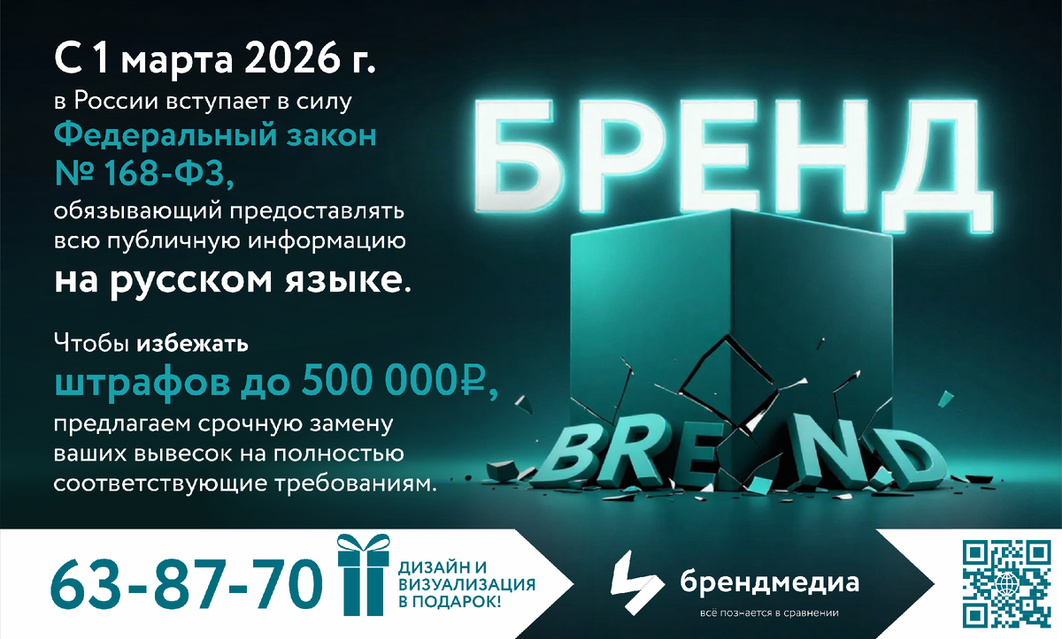 Уважаемые Клиенты! С 1 марта 2026 года в России вступает в силу Федеральный закон № 168-ФЗ от 24 июня 2025 года, обязывающий предоставлять всю публичную информацию для потребителей на русском языке. Выполним срочную замену ваших вывесок на полностью соответствующие требованиям варианты, чтобы избежать штрафов до 500 тыс. руб. для юридических лиц. Предлагаем: - срочное изготовление; - дизайн и визуализацию в подарок; - оперативный расчет. Здесь https://vk.com/brendmedia_72?w=wall-228156506_1351 подробно ответили на самые часто задаваемые вопросы + привели примеры, а именно: ▸ Какие вывески можно оставить без перевода на русский язык. ▸ Как использовать англицизмы на вывесках. ▸ Как правильно дублировать вывеску на английском языке. ▸ ому нужно успеть подготовиться ▸ Кто будет проверять соблюдение закона о русском языке. Предполагается, что контролировать соблюдение закона будут несколько органов: • Роспотребнадзор (РПН) • Администрации муниципалитетов. • Прокуратура. • УФАС. С иском о д