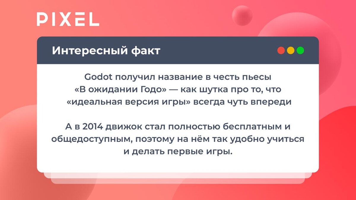 »? Помните это чувство, когда ты уверен, что «ещё чуть-чуть — и игра будет идеальной»… но постоянно добавляешь новые фичи? 😅 🎭 Название Godot — от пьесы «В ожидании Годо»: создатели выбрали его как шутку про вечное ожидание «той самой идеальной версии», которая всё время где-то впереди. 🌍 А дальше случилось лучшее для обучения детей: в 2014 движок стал открытым и бесплатным под лицензией MIT — можно спокойно учиться, разбирать проекты, делиться своими играми и не упираться в «платные стены».