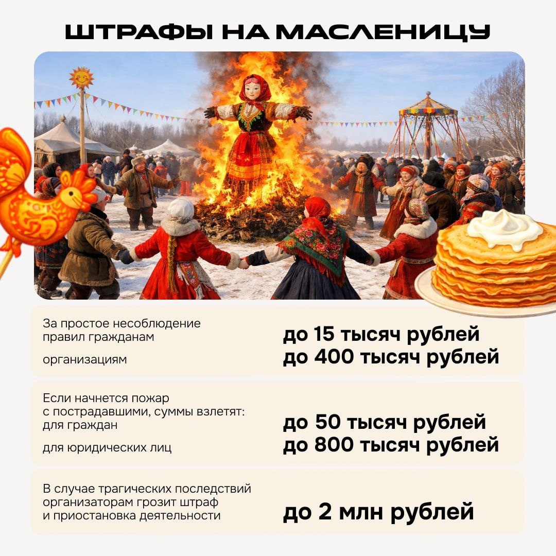 Масленичная неделя начнётся 16 февраля. Эксперт Общественной палаты предупреждает — специального штрафа за сам обряд нет, но есть суровое наказание за нарушение правил пожарной безопасности — о нем смотрите в карточке. А вы будете жечь на масленицу? 🔥 — конечно! 😁 — пока жгу только дедлайны. 📍Подписаться | Предложить новость | Дать «буст»