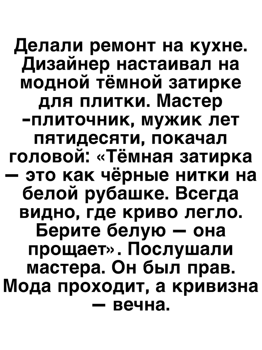Делали ремонт на кухне. Дизайнер настаивал на модной тёмной затирке для плитки. Мастер-плиточник, мужик лет пятидесяти, покачал головой: «Тёмная затирка — это как чёрные нитки на белой рубашке. Всегда видно, где криво легло. Берите белую — она прощает». Послушали мастера. Он был прав. Мода проходит, а кривизна — вечна.