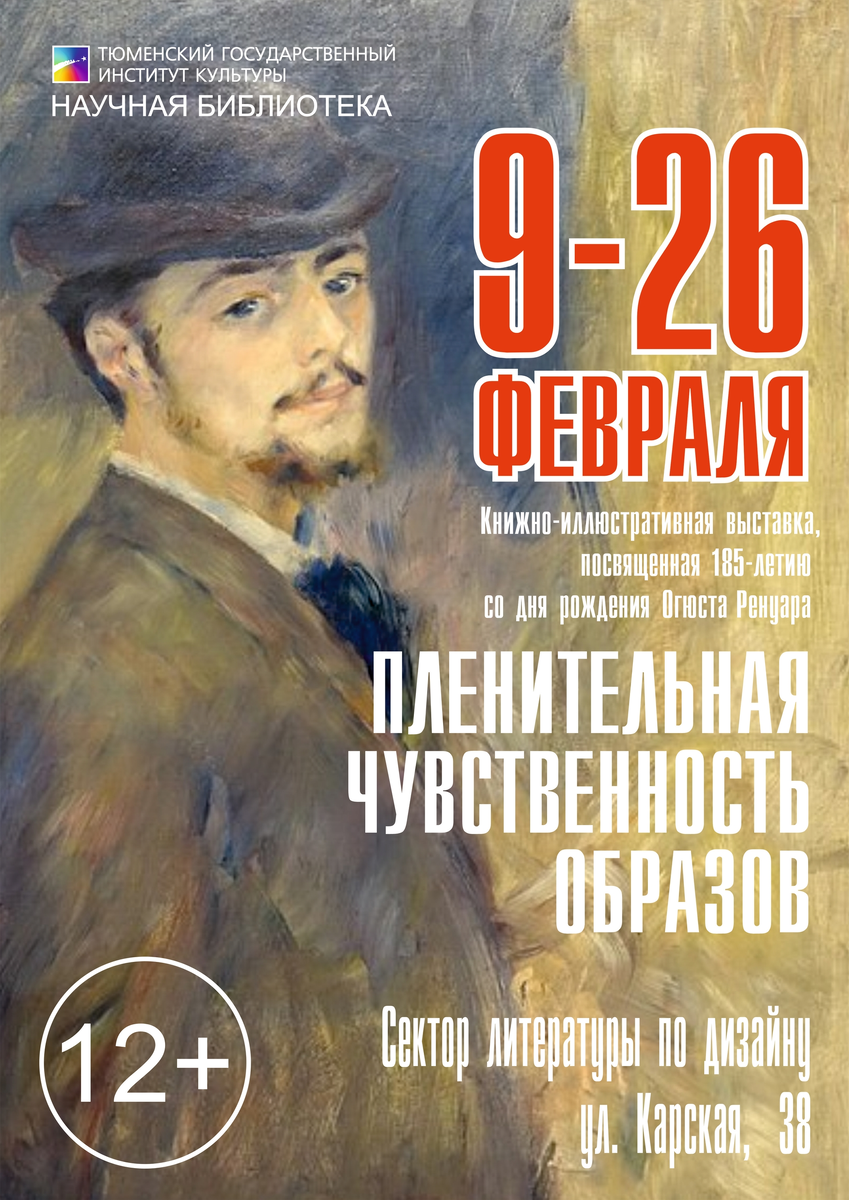 В секторе литературы по дизайну (ул. Карская, 38, ауд. 302) научной библиотеки ТГИК открылась книжно-иллюстративная выставка «Пленительная чувственность образов», посвященная 185-летию со дня рождения великого французского живописца, графика и скульптора Пьера Огюста Ренуара (1841–1919). 12+