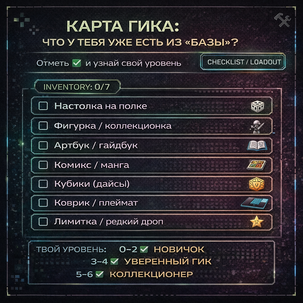 Тест на узнаваемость: у каждого гика рано или поздно появляется своя мини-коллекция “must have”. У кого-то она начинается с одной фигурки, а заканчивается отдельной полкой и фразой: «это не хлам, это экспозиция» Уровни гика: 0–2 — Новичок: ты только собираешь свой “набор героя”. 3–4 — Уверенный гик: уже есть стиль и любимые фандомы. 5–6 — Коллекционер: полка есть, система хранения есть, деньги… ну… тоже были 7 — Легенда: твой дом — это аккуратный музей, где всё “имеет историю”. Пиши в комменты: сколько у тебя?