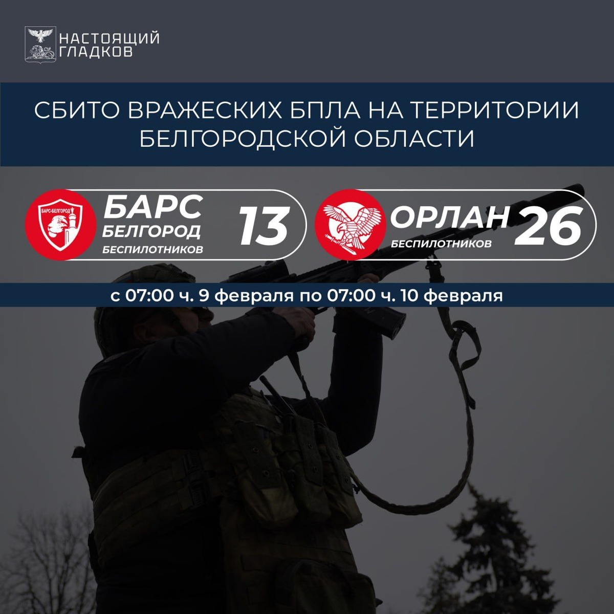 » С 07:00 ч. 9 февраля по 07:00 ч. 10 февраля ликвидированы 39 беспилотников «БАРС-Белгород» — 13 беспилотников:** 📍 подавлены РЭБ: — Краснояружский округ: 5 FPV-дронов; — Шебекинский округ: 3 FPV-дрона. 📍 сбиты из стрелкового оружия: — Белгородский округ: 1 FPV-дрон. — Шебекинский округ: 4 FPV-дрона. **«Орлан» — 26 беспилотников: ** 📍подавлены РЭБ: — Белгородский округ: 3 FPV-дрона; — Краснояружский округ: 6 FPV-дронов. 📍 сбиты из стрелкового оружия: — Валуйский округ: 4 FPV-дрона; — Грайворонский округ: 3 FPV-дрона; — Шебекинский округ: 4 FPV-дрона. 📍 подавлены РЭБ совместными усилиями подразделения «ОРЛАН» и бойцов самообороны: — Белгородский округ: 1 FPV-дрон; — Шебекинский округ: 5 FPV-дронов. Благодарю всех бойцов за эффективную работу по ликвидации вражеских беспилотников! Победа будет за нами! На связи с вами в [**MAX**](https://max.ru/vvgladkov) Вячеслав Гладков.
