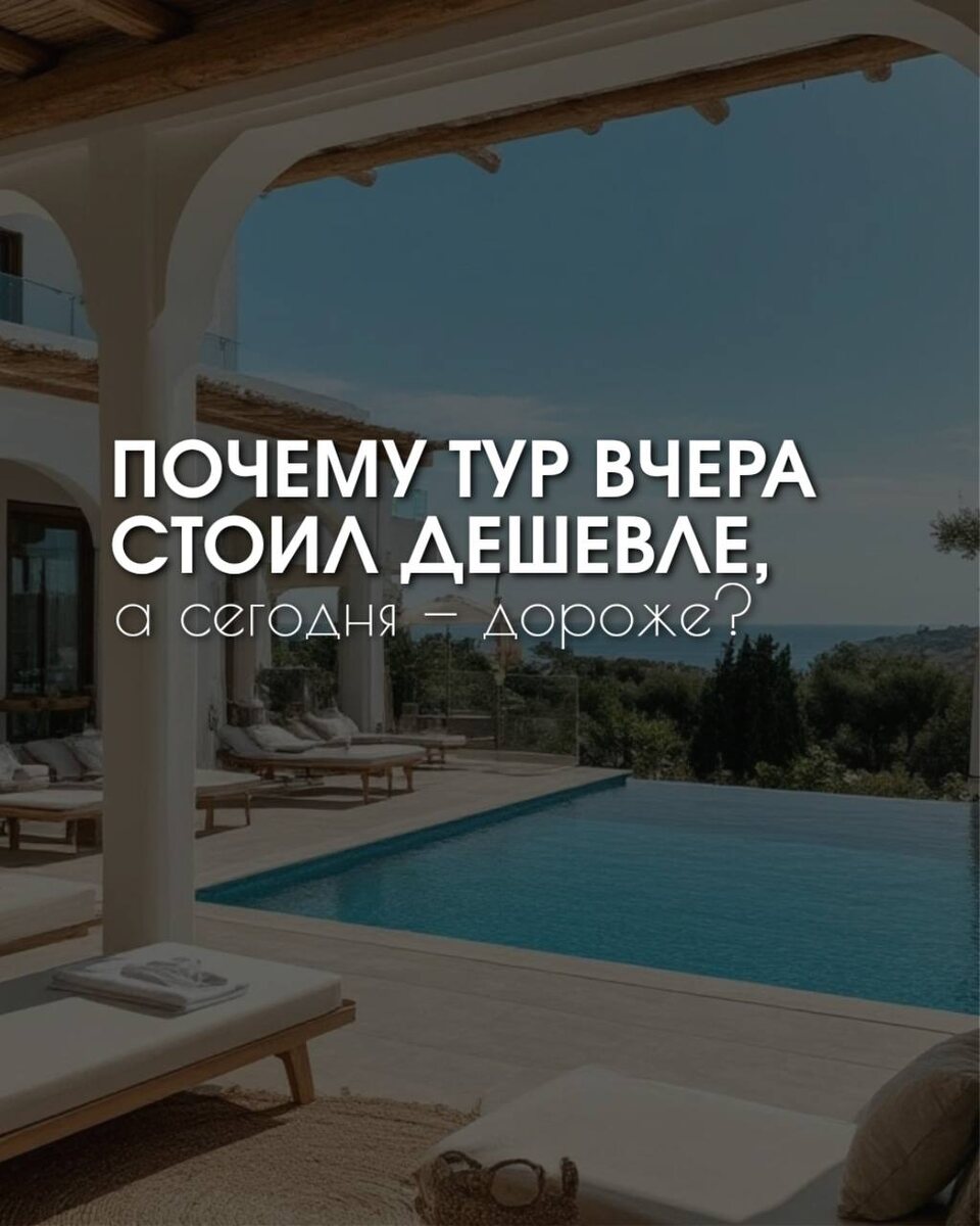 , а сегодня — дороже? Знакомая ситуация? Вчера вы запросили тур — цена одна Сегодня те же даты, тот же отель, тот же состав — а стоимость уже заметно выше Изменение стоимости — нормальная практика в туризме Иногда цена может меняться даже в течение одного дня Разбираемся почему ⬅️ ⚠️⚠️⚠️ Цена тура — не фиксированная цифра! Стоимость турпакета — это динамическая сумма, которая формируется в реальном времени и зависит сразу от нескольких факторов Фактор №1 — авиабилеты В стоимость тура входят авиабилеты У каждого рейса есть ограниченное количество мест по разным тарифам — вчера могли быть доступны билеты по минимальному тарифу; — сегодня они закончились, и остались более дорогие тарифы ☝️Чем меньше свободных мест на рейсе — тем выше цена на оставшиеся билеты Фактор №2 — курс валют Контракты туроператоров с отелями заключаются в евро и долларах ☝️ Даже небольшие колебания курса напрямую отражаются на стоимости тура в рублях Фактор №3 — спрос и сезонность В периоды повышенно