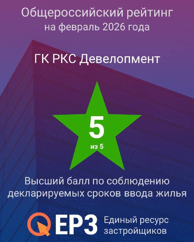 ! По данным портала ЕРЗ.РФ на 01.02.2026 г., нашей компании присвоен наивысший рейтинг — ★ 5 баллов по показателю своевременности ввода жилья. в Российской Федерации только 51% застройщиков имеют рейтинг ЕРЗ 5 баллов. Для нас это не просто цифры — это подтверждение надежности, ответственности и высокого качества работы всей команды «РКС Девелопмент». Спасибо нашим клиентам за доверие, партнёрам — за сотрудничество, команде — за профессионализм! Продолжаем строить точно в срок и с максимальным качеством 👍 #РКСДевелопмент #ЕРЗ