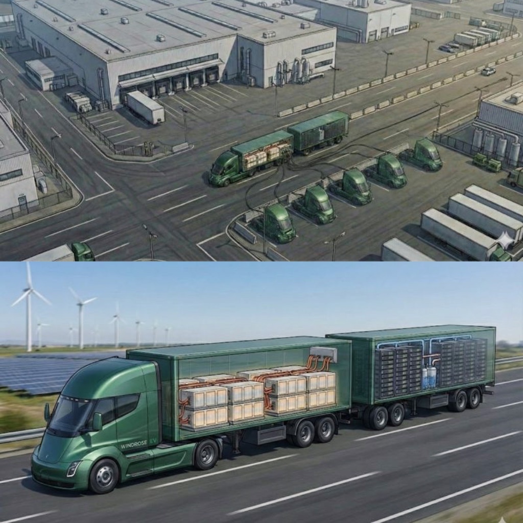 Как продать инвесторам картинку от нейросети Все так помешались на инфраструктуре для ИИ, что теперь дата-центры пытаются запихнуть даже в грузовики. Китайский стартап Windrose , который строит электрические тягачи и пытается конкурировать с Tesla Semi, решил, что просто возить грузы скучно. Их CEO Вэнь Хань анонсировал «новую продуктовую линейку»: мобильный вычислительный кластер и гигантскую батарею, упакованные в стандартные морские контейнеры. Идея в том, чтобы питать удалённые и автономные объекты. По задумке стартапа, один контейнер везет батарею на 4 МВт·ч, второй – серверные стойки с мощностью инференса 0,5 МВт. Все это должен тянуть их флагманский тягач R700. Правда, пока анонсированная «продуктовая линейка» существует исключительно в воображении автора и нейросетей. Иллюстрации к посту CEO сделаны в Google Gemini, причем CEO даже не стал убирать водяные знаки генератора. То есть он представил даже не прототип, а буквально сделанную на коленку в ИИ визуализацию с кратким описа