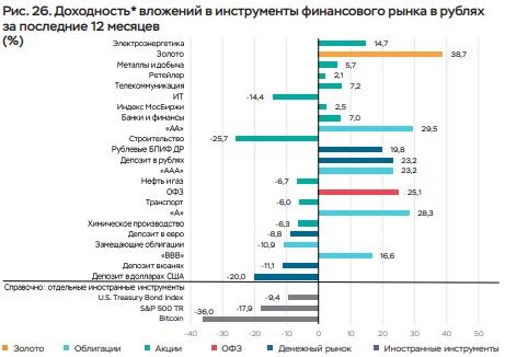 Банк России определил активы, продемонстрировавшие максимальную и минимальную полную доходность за период с февраля 2025 по январь 2026 года. При расчёте доходности рублёвых инструментов учитывались изменения рыночных цен, а также выплаты дивидендов по акциям и купонов по облигациям. Для инструментов, номинированных в иностранной валюте, дополнительно принималась во внимание динамика курса рубля к соответствующей валюте. 📈 Лидеры периода: золото +38,7%; корпоративные облигации от +16,6% до +29,5%; ОФЗ +25,1%; рублёвые депозиты +23,2%. 📉 Аутсайдеры периода: криптовалюты -36,0%; депозиты в иностранной валюте и замещающие облигации от -8,8% до -20,0%; акции отдельных отраслей (строительство и ИТ снизились на 25,7% и 14,4% соответственно). ❗️Такой результат наглядно демонстрирует, что более рисковые инструменты не всегда обеспечивают более высокую доходность. В рассматриваемый период консервативные инструменты и защитные активы оказались более устойчивыми к волатильности и принесли ин