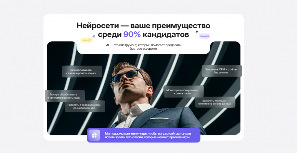 Научитесь ускорять работу и масштабировать продажи с помощью нейросетей на курсе «ИИ-сотрудники и нейросети для отдела продаж» — всего за 2 месяца вы познакомитесь с 10+ ИИ-инструментами и узнаете, как сэкономить до 30% времени на ведении сделок, формировании КП и работе с возражениями клиентов.