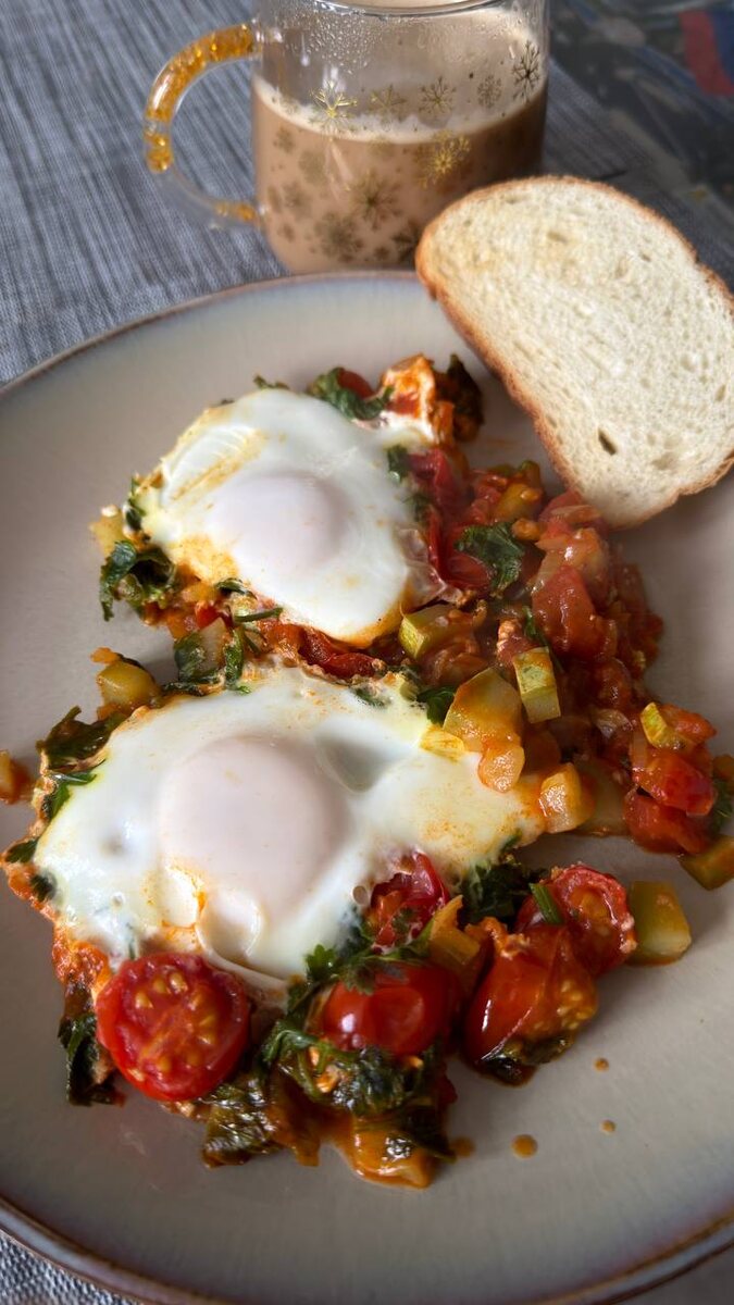 ! Практическая схема (очень рабочая) Сначала: салат / овощи Затем: мясо, рыба, яйца, творог Потом: жиры (если есть) И только потом: рис, картофель, хлеб, десерт Даже простое правило «сначала салат» уже даёт эффект. ‼️ну и конечно, добавляйте физическую активность! На завтрак у меня была шакшука (подобие): Томаты+немного томат пасты Цукини Лук,чеснок Зелень Яйца И благодарность себе за то, что у нас уже есть!❤️ это важно!