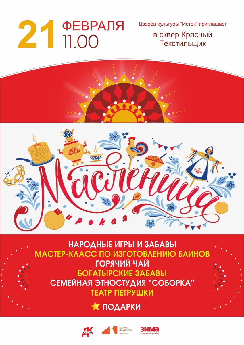 💥 Масленицу ждали? 😍 Приглашаем вас на яркий и весёлый праздник! 🔆Будет много радости, тепла и традиционных забав. Что вас ждёт: 🥞изготовление и бесплатная раздача блинов; ☕горячий чай; 🪆масленичные песни — погрузитесь в атмосферу народного праздника под задорные мелодии; 🏆🏋️♀️богатырские забавы — испытайте силу и отвагу в традиционных состязаниях; 🥳театр Петрушки — окунитесь в мир старинного кукольного представления; 🤗семейная этностудия «Сборка» — познакомьтесь с народными традициями. 🌞Не пропустите самый сытный и радостный праздник зимы! Приходите сами, зовите друзей и семью — будет весело!😃 📆 21.02.2026 🕛 11:00 🏢 Дворец культуры "Исток" 📍 м.о.Серпухов, мкрн Красный Текстильщик, ул. Красный Текстильщик, 6А Вход свободный❗️ ✅ Мероприятия Серпухов https://dzen.ru/id/66f01c6eb4c6fe60c9ca1608 http://vk.com/serpukhov_events http://dzen.ru/serpukhov_events