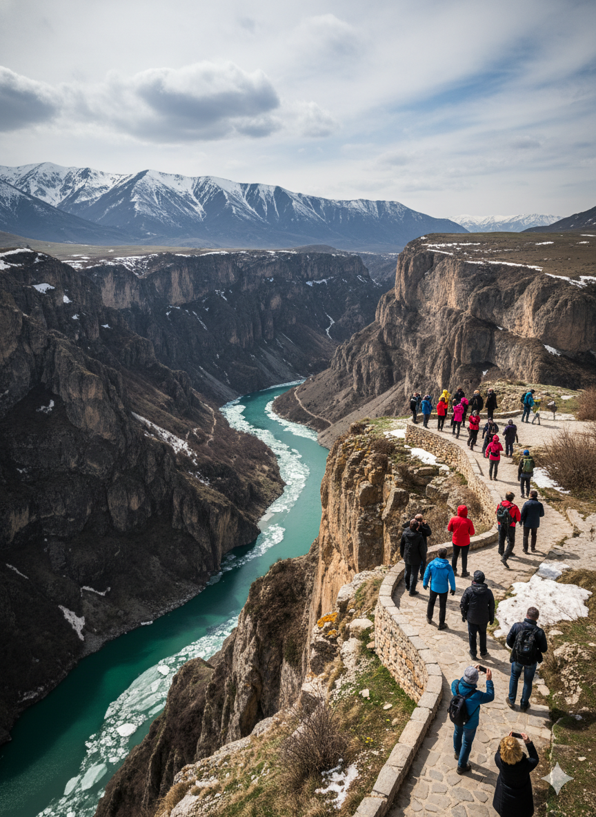 Со смотровых площадок в посёлке Дубки видна вся мощь каньона — река внизу кажется тонкой нитью. Можно спуститься к воде и прокатиться на катере мимо «плачущих» водопадов. В марте каньон особенно фотогеничен: весенняя дымка придаёт пейзажу мистическую глубину, а туристов заметно меньше, чем летом.