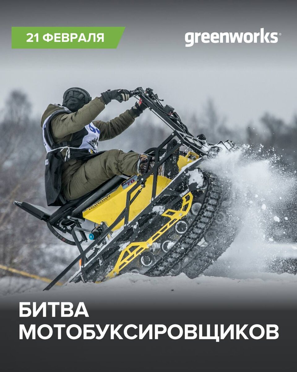 «Битва мотобуксировщиков», фестиваль со снегоходной техникой, пройдет уже в следующую субботу! 21 февраля на квадротреке «Формула 7» гостей ждет выставка снегоходов, снегокатов и самоделок, а также самые зрелищные шоу гонщиков. Greenworks, как официальный партнер мероприятия, подготовил для самых активных участников ценные призы от бренда. #greenworksrussia #переходиназеленый #greenworks_мероприятия