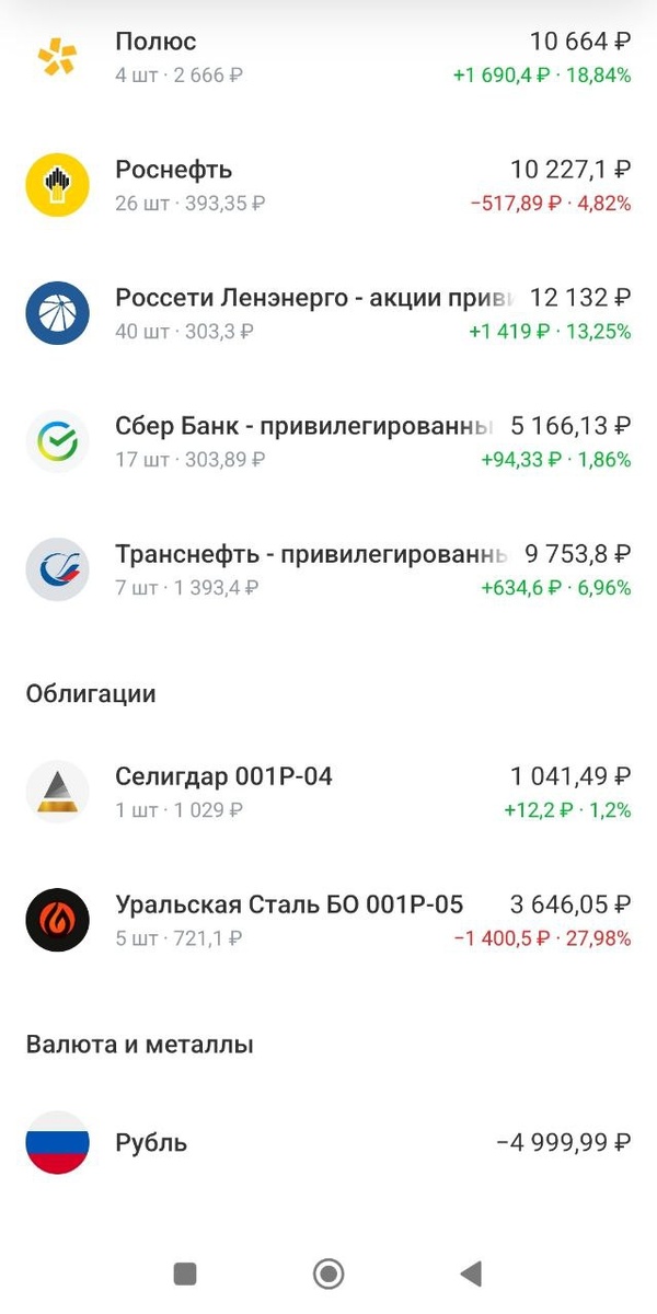 Публичный портфель😁 Я тут совсем забегался с переездом и отпуском, давно не было рубрики о черепахо_инвестициях. Напомню: Это челлендж, в котором мы делаем еженедельные пополнения и формируем долгосрочный портфель не смотря ни на что. Основная задача - сформировать дисциплину инвестировать. Иксы -вторичны. Стартовые данные: Начальный капитал - 10.000р Пополнения - 2500 в неделю, либо кратно покупке +/-100/300р Стремимся к балансу 75/25 в акциях большую часть. Посмотрим, как будем выстраивать баланс дальше. 🤑Сегодня: Докупил Роснефти на 2.7к рублей. Совсем недавно, относительно были купону от Урал стали и дивы от Роснефти. Цель: продолжать реинвестировать и пополнять портфель новыми бумагами. Помним, мы делаем ДОЛГОСРОЧНЫЙ ПОРТФЕЛЬ. Итоговый баланс и состав портфеля - на скринах. В портфеле также: Сбер - Банк топ 1. Рассчитываю на дивиденды и рост акций Норникель - ставка на восстановление у металлургов и конечно на рост металлов. Полюс - золото "вечный актив" Рассвет на