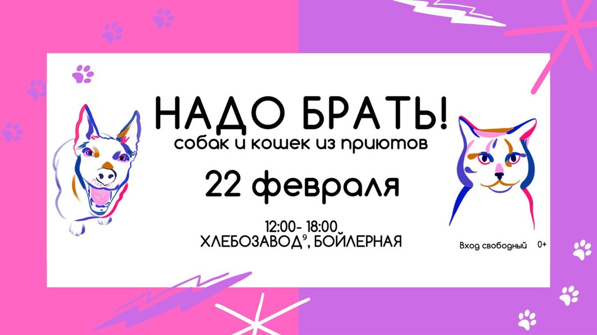 Москва! Приходите на выставку бездомных животных #НадоБратьЗимой2026 22 февраля 2026 года в пространстве БОЙЛЕРНАЯ на Хлебозаводе9 пёсики и котики из приютов будут ждать именно вас! Хвостатые участники социализированы, здоровы, привиты, кастрированы, и все они ищут дом! Животные передаются в семьи бесплатно после собеседования и по договору. Не забудьте взять с собой паспорт. Если у вас нет возможности забрать питомца домой, но вы хотите помочь, это легко сделать: Приходите и вы поймете, что НАДО БРАТЬ! 22 февраля 2026 с 12 до 18 часов Хлебозавод9, пространство БОЙЛЕРНАЯ, Новодмитровская улица, д. 1, стр. 17,