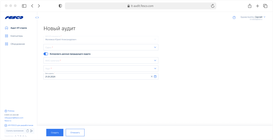 Транспортная группа FESCO имеет более 30 судов в управлении. Борты оборудованы техникой, ИТ-системами, программами. Периодически судна проходят технологический аудит. Для удобства проверки мы разработали веб-систему и мобильное приложение. ИТ-специалист начинает работу еще на суше в веб-приложении — создает новый аудит, заполняет общие данные, задачи. Удобная функция — скопировать прошлую анкету. Автоматически подтягиваются все данные последнего обследования судна. Эта небольшая возможность облегчает жизнь специалистам. Во-первых, в прошлом судозаходе аудитор уже прописал задачи на следующий и копирование переносит задания в текущую анкету. Специалисту остается сверить и скорректировать задачи. Во-вторых, когда аудитор обновляет информацию о компьютерах, оборудовании, то измененные данные отдельно подсвечиваются. Акценты помогают выделить разницу между предыдущим и настоящим аудитами. Кроме предварительного создания аудита, специалист изучает информацию о прошлой проверке. В веб-прилож
