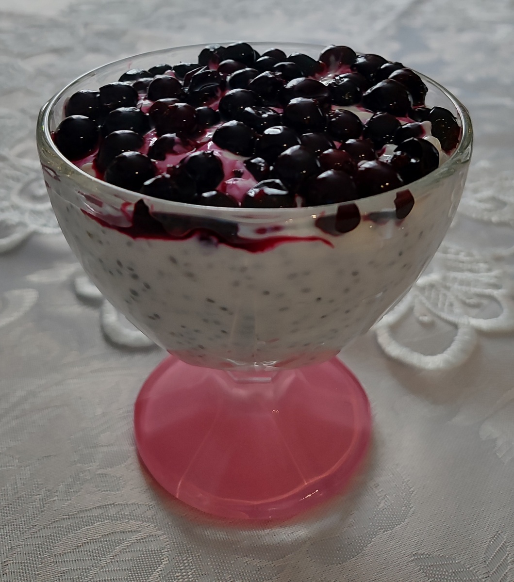 Посмотрела на сроки – а им уже тоже скоро кирдык) Ну, я и решила приготовить себе десерт всего из четырёх ингредиентов – баночки (235г) греческого йогурта, 4-х чайных ложек (20г) чиа, одной чайной ложки (10г) мёда и 40г замороженной чёрной смородины.