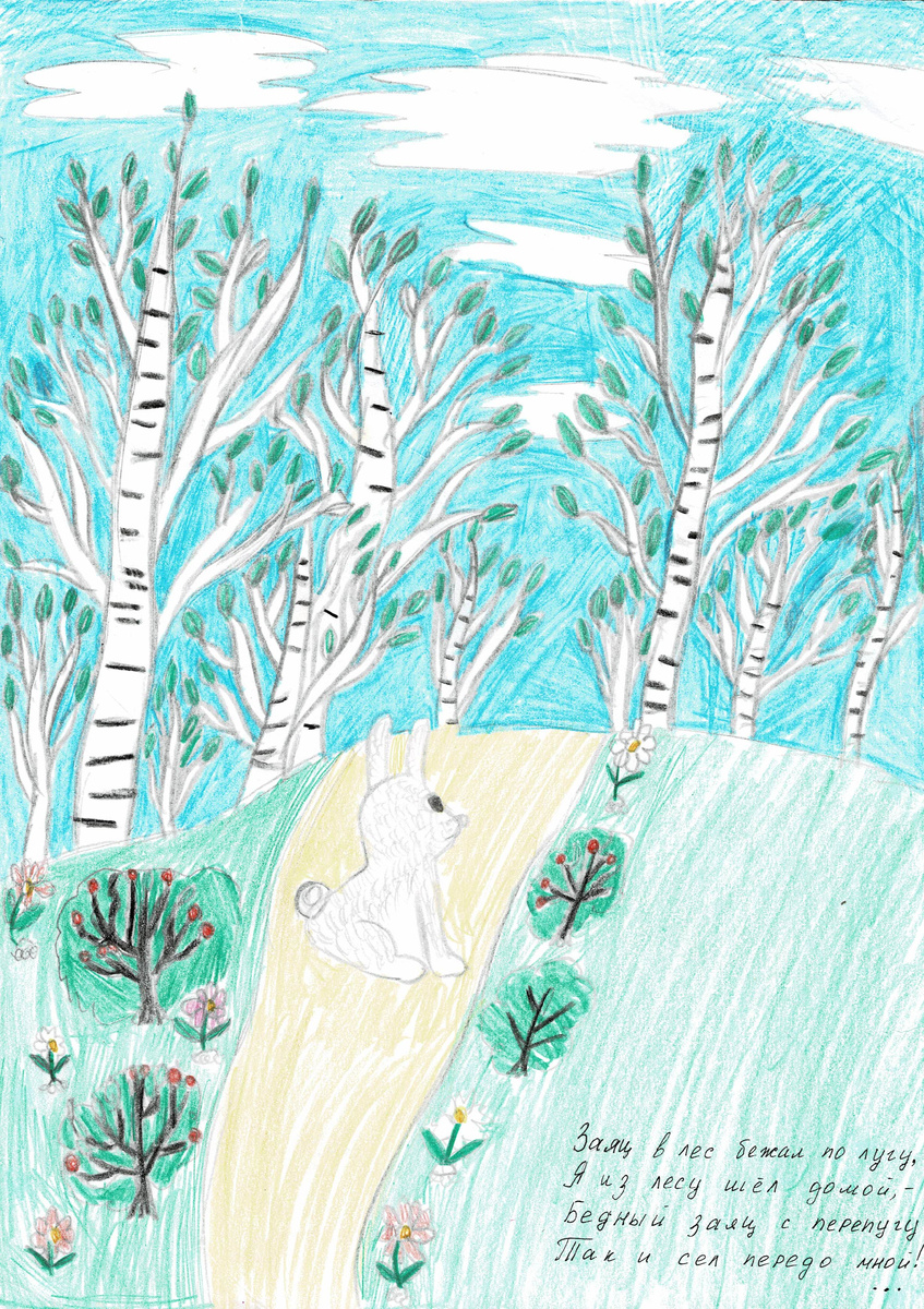 Описание: Иллюстрируется стихотворение Николая Рубцова "Про зайца". Рисунок выполнен цветными карандашами. Вдохновилась данным стихотворением из любви к животным. А также, однажды, когда мы возвращались домой от бабушки, то в поле увидели бегущего зайца. И летом, когда ходили за грибами, тоже