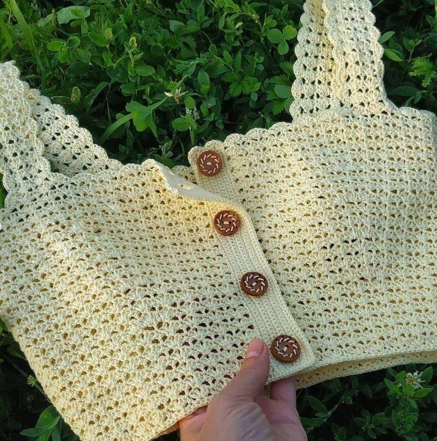 Очень просто связанный топ, но при этом очень симпатичный. Не нужно никаких длинных описаний, сложных расчетов и выкроек. На фото хорошо видно, что на груди сделаны прибавки, а все остальное вяжется прямо.