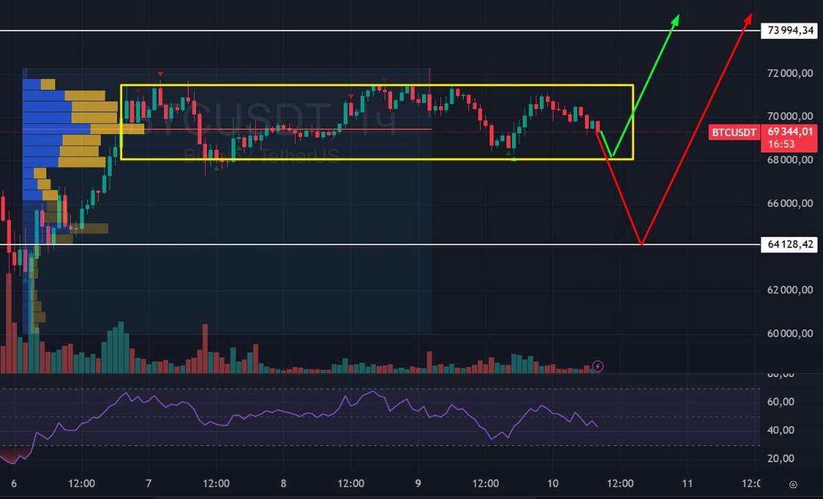 🟢Вчера в биткойне была замечена слабость, но на американской сессии всё выкупили. Сейчас он снова пытается клюнуть вниз. 🟢Тут вижу два варианта: ©️либо откуп и рост начнется от нижней границы желтого прямоугольника ©️либо идем на поддержку, поедая всю ликвидность снизу. Но потом все равно вверх 🚗 Два дня проявления слабости - плохой знак. Так что вероятность красного сценария высокая. Жду коррекцию по биткойну и по металлам, но стратегически потом жду рост на перехай. #биткойн #btcusd #btc #ibit #bogdanoffinvest $BTJ6 $BTH6 $BTG6 $IBH6