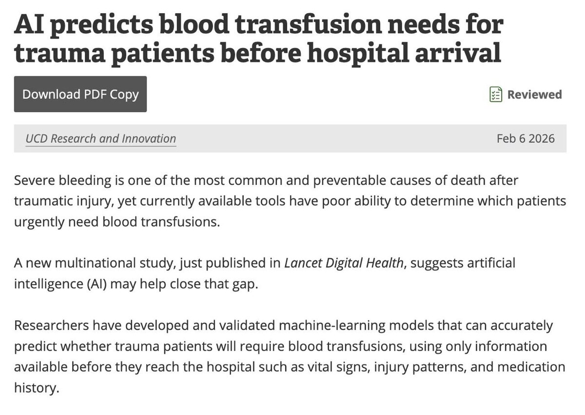 В крупном международном исследовании, опубликованном в *The Lancet Digital Health*, показано, что модели машинного обучения способны заранее предсказывать необходимость переливания крови у пациентов с травмами — прямо на этапе оказания первой помощи. Как это работает: Модель анализирует только догоспитальные данные: - жизненные показатели (пульс, давление, дыхание) - тип и тяжесть травм - принимаемые лекарства - базовую информацию о состоянии пациента На основе этих данных AI прогнозирует: - потребуется ли переливание крови - нужна ли срочная операция - риск смерти от массивного кровотечения И самое важное: Модели показали более высокую точность, чем традиционные инструменты триажа в приёмном отделении. Масштаб исследования впечатляет: - данные более 418 000 пациентов - международная команда исследователей - валидация на разных медицинских системах Если врачи знают о рисках до прибытия пациента, они могут: - заранее подготовить донорскую кровь - собрать хирургическую команду - с