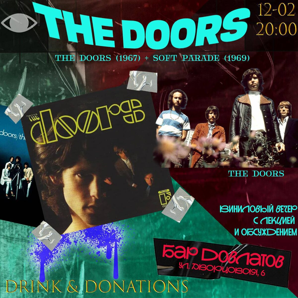 THE DOORS 🗓️ 12 февраля, 11 февраля, сбор гостей в 19:30, начало в 20:00 📍бар Довлатов Слушаем два альбома The Doors, которые показывают разные этапы и подходы группы к форме и звучанию. Дебютный The Doors и более экспериментальный The Soft Parade хорошо иллюстрируют, как менялась группа в конце 60-х и какие задачи она перед собой ставила. The Doors (1967) — один из самых сильных дебютов в истории рок-музыки. Здесь сформировался фирменный звук группы: орган Рея Манзарека, блюзовая основа, минималистичная ритм-секция и вокал Джима Моррисона, который работает скорее как рассказчик, чем как фронтмен в привычном смысле. Альбом включает «Break On Through», «Light My Fire» и «The End» — песни, определившие образ The Doors на годы вперёд. The Soft Parade (1969) — самый спорный и при этом самый необычный альбом группы. Впервые The Doors активно используют духовые и струнные аранжировки, отходя от привычного минимализма. Пластинка звучит фрагментарно и эклектично, но именно в этом многие