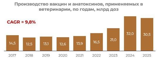 Итоги 2025 г. В 2025 г. объем производства вакцин, применяемых в ветеринарии, достиг значения в 30,5 млрд доз, что более чем в 2 раза превышает показатель 2017 г., но на 4,7% ниже высокой базы 2024 г. Среднегодовой темп роста за рассматриваемый период составил 9,8%. В декабре 2025 г. объем производства вырос на 11,3% (+0,26 млрд доз) относительно ноября 2025 г. и составил 2,56 млрд доз. Относительно декабря 2024 г. зафиксирован спад на 14,5% (-0,43 млрд доз). #Статистика_Emeat