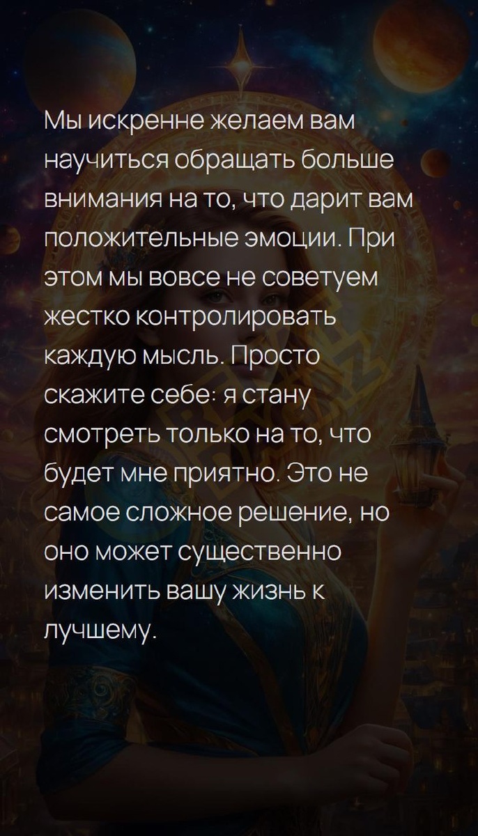 Мы искренне желаем вам научиться обращать больше внимания на то, что дарит вам положительные эмоции. При этом мы вовсе не советуем жестко контролировать каждую мысль. Просто скажите себе: я стану смотреть только на то, что будет мне приятно. Это не самое сложное решение, но оно может существенно изменить вашу жизнь к лучшему. Архитектура вашей души | Ваш Ангел и Демон T | VK | Pin | YouTub | Dzen #личность #энергияжизни #чудокаждыйдень #истина #добро #мысль #ресурс #рекомендации #довериемастеру #10число #10февраля