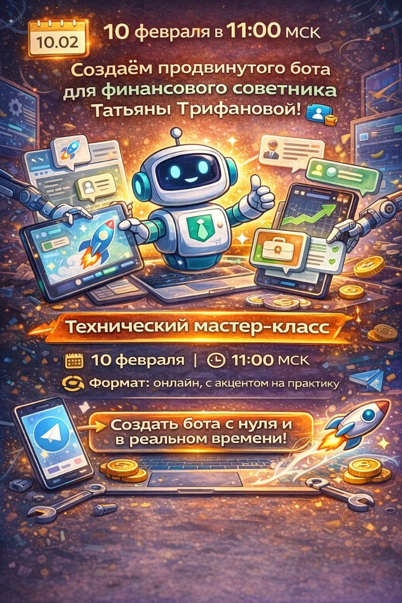 клиентов финансового советника Татьяны Трифановой! 🤖💼 Убедитесь, как наш бот оживает прямо у вас на глазах: начнёт привлекать внимание, «разогревать» интерес и завоёвывать доверие целевой аудитории, превращая подписчиков в реальных клиентов 💥📈. И это не просто теория — во время мастер-класса мы будем следить за работой бота в реальном времени! 👀🔥 Если устали тратить время на холодные звонки и ненастоящие рассылки, и хотите освоить автоматизацию для развития бизнеса — этот эфир создан для вас! 🔄🚀 📅 Дата: 10 февраля ⏰ Время: 11:00 мск 📌 Формат: онлайн, с акцентом на практику и живое участие 🎤💬 Готовы создать бота, который действительно работает? Ловите ссылку и присоединяйтесь! Чат бесплатного обучения →Вход свободный: Zoom ссылка в гостевом чате: https://t.me/gostevoypartnerskiy_bot?start=REF23870E1D Если вас интересует не просто «послушать», а реально понять, куда всё движется и как этим пользоваться — приходите. Будет глубоко. И по-новому 😉