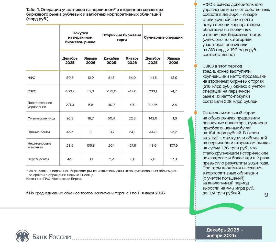 : Что на самом деле происходит с облигациями? Вы когда-нибудь задумывались, почему рекорды на рынке часто становятся предвестниками проблем? По данным свежего отчета Банка России (Обзор рисков финансовых рынков (Декабрь 2025 — январь 2026), 2025 год стал историческим: 💰 покупки корпоративных облигаций частными инвесторами достигли 1,26 трлн руб. 🤡. 👉 Только вдумайтесь - это колоссальный приток капитала. Но посмотрите на действия умных денег. В январе 2026 года крупнейшие банки (СЗКО) стали нетто-продавцами ОФЗ, реализовав бумаги на 115 млрд руб. Пока розничные инвесторы искали тихую гавань, профессионалы начали осторожно выходить в кэш или перекладываться на фоне роста инфляционного давления и НДС. Я понимаю Ваше стремление к надежности. Облигации кажутся простыми, но без понимания циклов ликвидности они превращаются в очередную ловушку замороженного капитала. В Aromath участники всегдя видят рынок глазами тех, кто этими потоками управляет. Разбираем детали стратегий по вклада