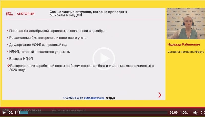 рассмотрела Надежда Рабинович, методист компании Форус в лекции на тему Формирование отчетности 6-НДФЛ за 2025 год на примере программ 1С:ЗКГУ и 1С:ЗУП, ответы на вопросы Отзыв слушателя: Лектор Надежда Рабинович хорошо раскрыла материал, были приведены примеры, что облегчило восприятие данных тем. Спасибо! 👉 Смотрите бесплатно полную видеозапись лекции 🚨Подписывайтесь на @lector_1c