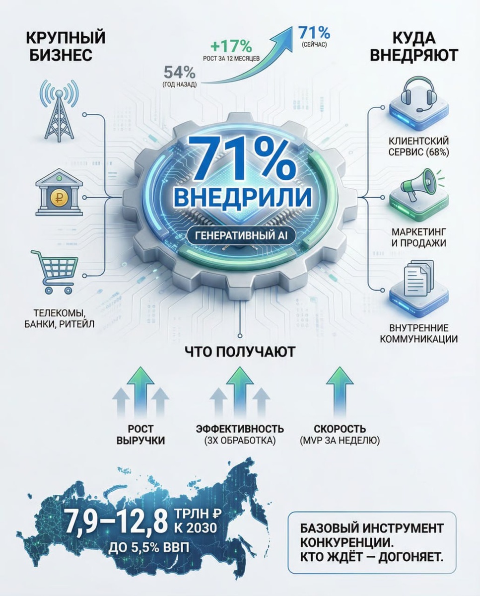 Яндекс с "Яков и Партнёры" опросили 150 технических директоров крупных компаний. 71% применяют генеративный AI. Год назад было 54%. Рост на 17% за 12 месяцев. Это значит реально работающие решения. Дело в том, что это не стартапы-энтузиасты. Это крупный бизнес. Телекомы. Банки. Ритейл. Они считают каждый рубль. И они внедряют AI. 👉Куда внедряют? Клиентский сервис - 68% компаний используют речевые технологии и чат-боты для обработки обращений. Маркетинг и продажи - AI генерит контент, персонализирует офферы, пишет письма. Внутренние коммуникации - автоматизирует рутину, составляет отчёты, обрабатывает документы. 📌Что получают? Рост выручки. E-commerce персонализирует рекомендации - клиенты покупают больше. Телекомы автоматизируют саппорт - обрабатывают в 3 раза больше обращений теми же силами. Банки ускоряют запуск новых продуктов - от идеи до MVP за неделю вместо месяца. К 2030 году эффект от AI оценивают в 7,9-12,8 трлн рублей. До 5,5% ВВП. Это новая выручка. Новые продукты. Луч