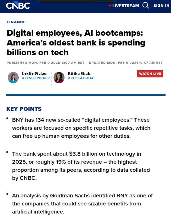 **. И это не эксперимент, а полноценная часть операционной работы. Что делают «цифровые сотрудники»: - Работают 24/7 без перерывов - Выполняют узкоспециализированные повторяющиеся операции - Обрабатывают платежные процессы и операционные задачи - Снимают нагрузку с команд По словам руководства, цель не в замене людей, а в другом: AI берёт на себя рутину → люди переходят к более сложным, аналитическим и стратегическим задачам. Интересные цифры: - Сейчас в банке — 48 100 сотрудников - В 2023 году было около 53 400 - Инвестиции в AI и технологии могут дать +19% к прибыли на акцию AI становится полноценной рабочей силой, а не просто инструментом. Главный тренд: Компании не увольняют людей ради AI. Они перераспределяют работу: Рутина → AI Решения, стратегия, контроль → человек Вывод для специалистов: Самый ценный навык сейчас - не конкурировать с AI в рутинных задачах, а работать на уровне, где вы управляете системами, а не выполняете операции. cnbc.com/2026/02/09/digital-emp