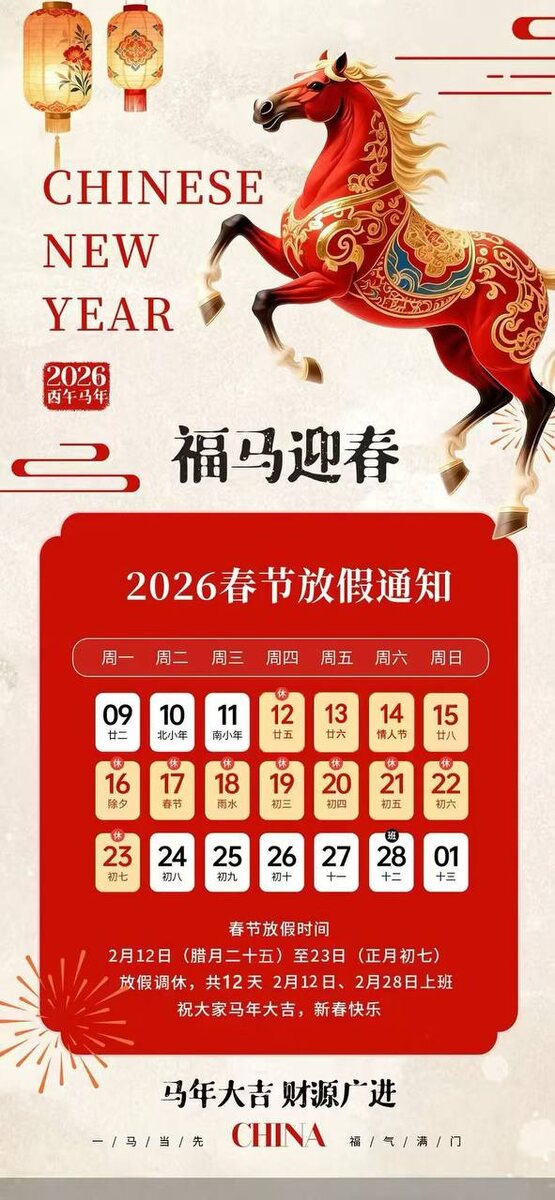 🏮Праздник Нового Весеннего года в Китае: 12 дней с 12 февраля (Четверг) по 23 февраля (Вторник) 2026 года, а 24 февраля (восьмая среда первого дня) официально начнётся новая неделя!
