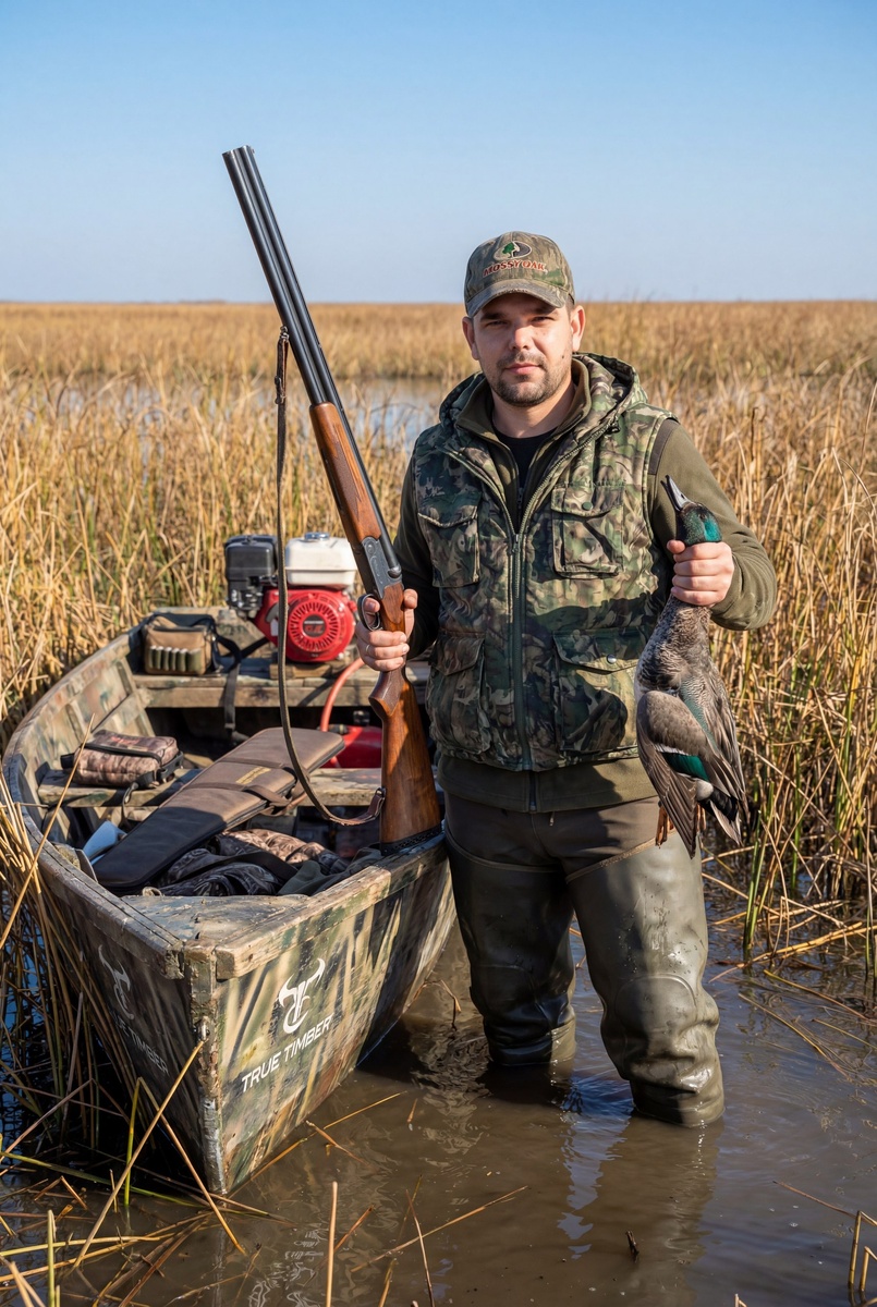 По просьбе подписчика Ильи. 🤖Генерировать можно здесь: 👉БОТ ДЛЯ ГЕНЕРАЦИИ Выбираем режим Nano Banana Pro ИНСТРУКЦИЯ 1. *Реалистичный фотоснимок мужчины с референсного фото. Он стоит по пояс в мутной воде, держа в правой руке крупную утку (вероятно, чирка или свиязу) за лапы, а в левой — двуствольное охотничье ружьё Иж-43 с деревянным прикладом и стальным стволом. На нём надета тактическая охотничья экипировка: зелёный камуфляжный капюшонный жилет поверх тёмно-оливковой рубашки, высокие резиновые сапоги до бёдер, на голове — потрёпанный бейсболка с логотипом «Mossy Oak». Рядом — старая деревянная лодка с камуфляжной раскраской (паттерн «True Timber»), в ней видны: красный бензиновый мотор, сумка с боеприпасами, ружейный чехол и сложенная одежда. Лодка частично погружена в воду, вокруг — высокая сухая тростниковая растительность золотисто-коричневых оттенков. Фон — бескрайнее болото под ясным голубым небом без облаков. Свет — яркий дневной, солнце слева спереди (угол ~45°), создаёт мя