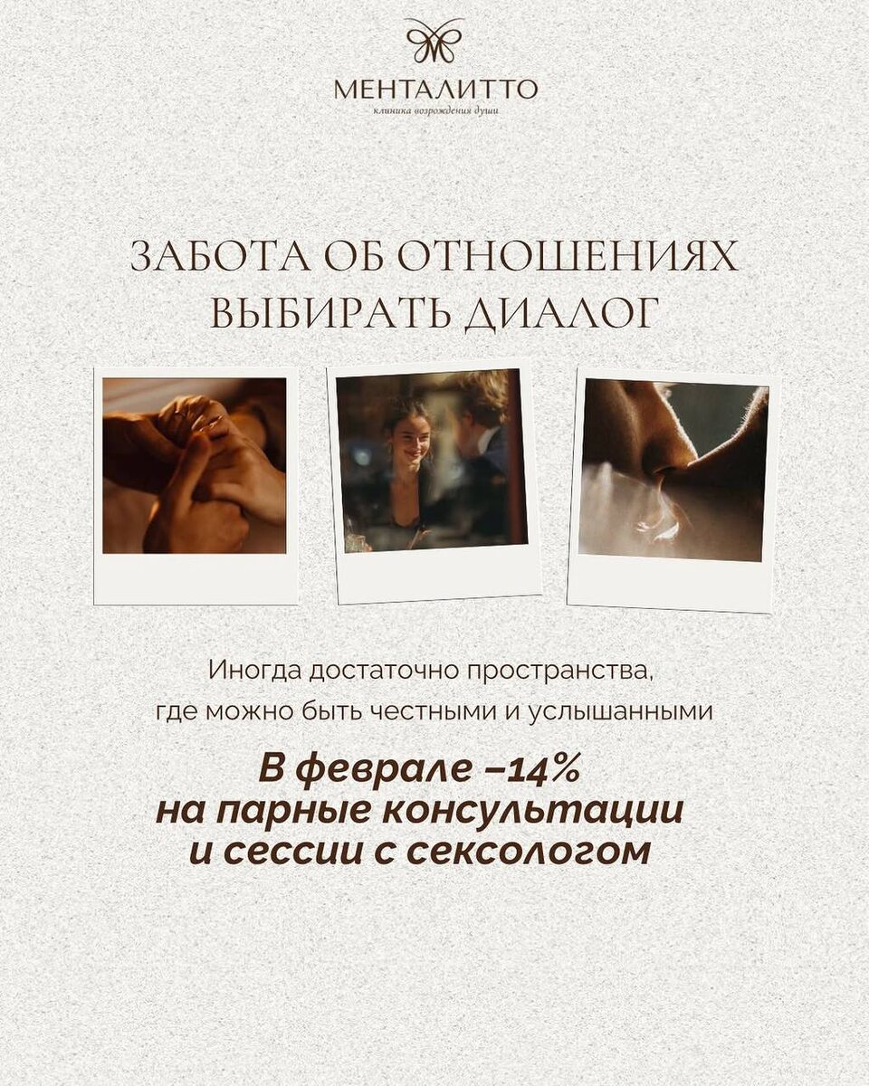🤍 Иногда отношениям нужна не коррекция, а внимание и бережный диалог. Пространство, где можно говорить честно и слышать друг друга. Скидка действует на парные консультации и отдельные сессии с сексологом до конца февраля. Без спешки. Без давления. Рядом даже в самые сложные моменты 🫂
