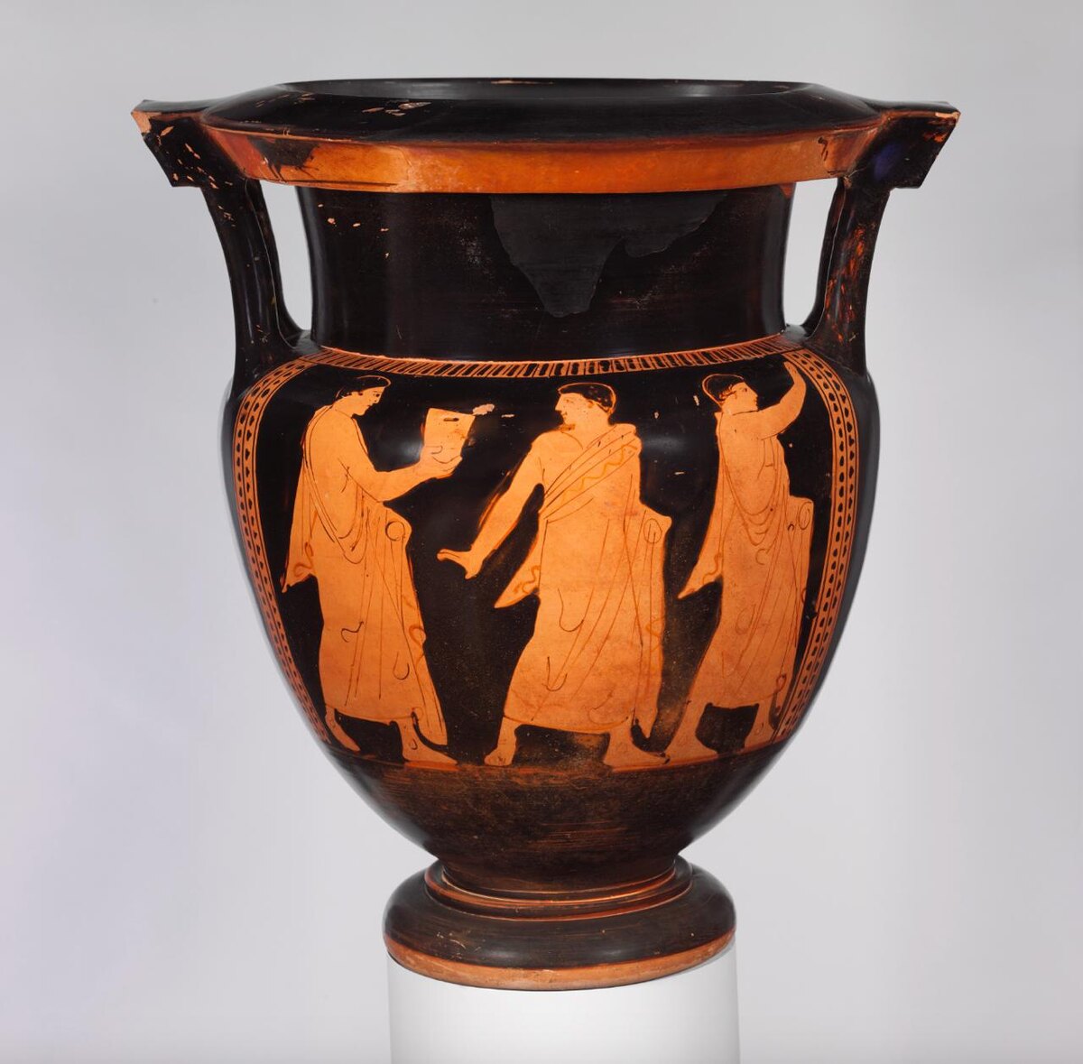 Иначе Посейдон поднимет на смех, как в "Птицах" Аристофана: Ты что ж на левое плечо накинул плащ? На правое направь его по правилам. Беда с тобой! Ты хуже Лаисподия. О, демократия, куда ведешь ты нас? Урод в послы богами избирается! Однако, если руководствоваться этим переводом С. Апта, можно попасть в неловкую ситуацию. Ведь греческое ἐπιδέξια означает не "на правое плечо", а, как ни странно, “на левое”. Судя по изображениям на вазах (и по комментариям к этому месту у Аристофана), один конец гиматия набрасывали на левое плечо, протягивая второй вокруг спины через правое бедро и оставляя правое плечо и руку свободными. (Возможно, левши делали наоборот? Мы не знаем). Джентльмены с краснофигурного кратера из музея Метрополитен демонстрируют, как правильно носить гиматий в этом сезоне 😎