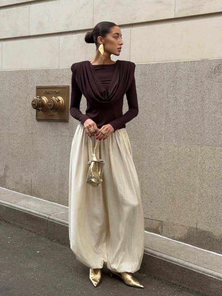 Брюки-алладины — это нечто большее, чем просто одежда. Этот силуэт, вдохновленный восточной культурой, представляет собой свободные, мягкие штаны с выразительным объемом в области бедер, которые сужаются к щиколотке, создавая эффект «воздушности» и легкости. Исторически такие брюки перекликаются с гардеробом Северной Африки и Южной Азии — турецкие шалвары и южноазиатские шаровары служили прообразом этого фасона, который впервые попал в западную моду еще в начале XX века. Современные брюки-алладины — это не только этнический аксессуар для тематических вечеринок, но и полноценный элемент стильного гардероба весны-лета 2025–2026. Дизайнеры крупных домов моды и стилисты включают их в коллекции, предлагая новые версии из легких тканей, нейтральных оттенков и интересной конструкцией шва, который визуально структурирует силуэт. Этот фасон особенно выигрышно смотрится на фигурах с очерченной талией, поскольку объем внизу выгодно подчеркивает пропорции и создает эффект легкой, удлиненной линии