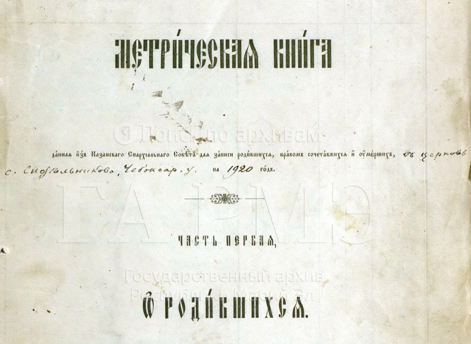 Метрические книги Ильинской церкви села Сидельниково для записи родившихся, бракосочетавшихся, умерших. 1 января 1919 — 31 декабря 1920 ГА Республики Марий Эл (ГАРМЭ), фонд № 305, опись № 2, дело № 970, стр. 41 скан. Метрическая книга, данная из Казанского Епархиального Совета в церковь села Сидельникова Чебоксарского уезда для записи родившихся, браком сочетавшихся и умерших на 1920 год. Часть вторая. О бракосочетавшихся. Стр. 59 скан. Апрель. № 4. 24 числа. Жених: села Сидельниково гражданин Феодот Феодоров Бычков, православного вероисповедания, вторым браком. 32 лет. Невеста: деревни Иван Беляк умершего Григория Яндова дочь Мария, православного вероисповедания, девица. 25 лет. Поручители: по женихе: села Сидельникова граждане: Иван Иванов Семенов и Никифор Максимов Орлов. По невесте: того ж села крестьяне: Трофим Димитриев Речков и Василий Максимов. Таинство венчания совершил: Мариинского посада священник Троицкого собора Павел Богатырёв. Псаломщик Иван Орлов. https://yandex.ru/ar