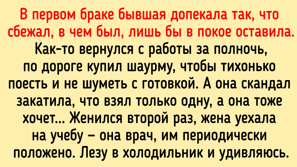 В первом браке бывшая допекала так, что сбежал, в чем был, лишь бы в покое оставила. Как-то вернулся с работы за полночь, по дороге купил шаурму, чтобы тихонько поесть и не шуметь с готовкой. А она скандал закатила, что взял только одну, а она тоже хочет. Женился второй раз, жена уехала на учебу — она врач, им положено периодически. Лезу в холодильник и удивляюсь: там все коробочками с едой забито. И записка: «С красной крышкой — греть, с синей — ешь так!» Стоял перед холодильником и плакал, честное слово.