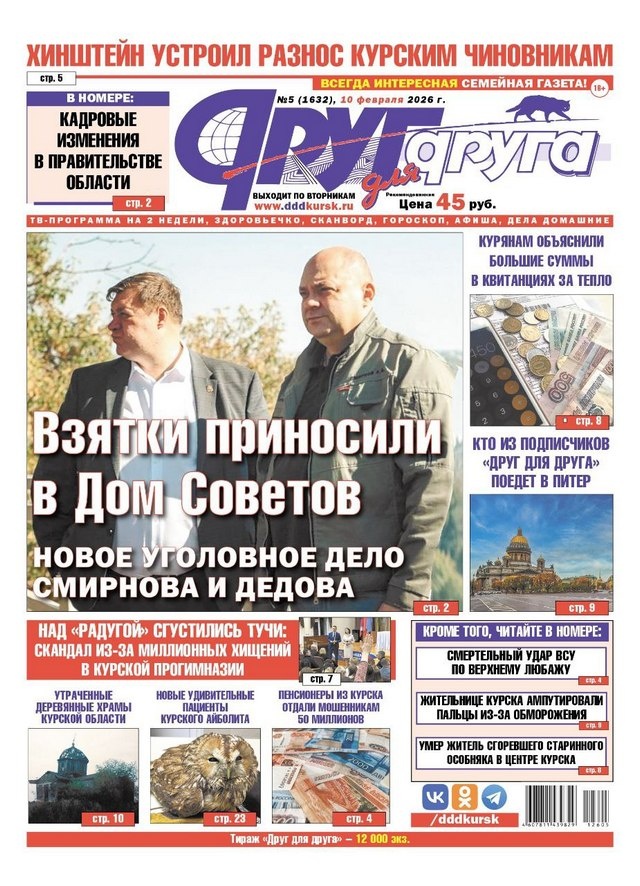 Во вторник, 10 февраля, вышел в свет свежий номер всегда интересной семейной газеты «Друг для друга» — одного из самых популярных и читаемых печатных изданий Курской области. Из него вы можете узнать следующее. • Хинштейн устроил разнос курским чиновникам. • Откаты приносили в Дом Советов. Смирнов и Дедов обвиняются в получении взяток. • Кадровые изменения в правительстве Курской области. • Курянам объяснили большие суммы в квитанциях за тепло. • Пенсионеры из Курска отдали мошенникам 50 миллионов рублей. • Кто из подписчиков газеты «Друг для друга» поедет в Питер и получит другие подарки. • Смертельный удар ВСУ по Верхнему Любажу. • Над «Радугой» сгустились тучи: скандал из-за миллионных хищений в курской прогимназии. • Утраченные деревянные храмы Курской области. • Новые удивительные пациенты курского айболита. • Жительнице Курска ампутировали пальцы из-за обморожения. • Выписать газету «Друг для друга» можно с любого месяца в любом действующем почтовом отделении Курской области и да