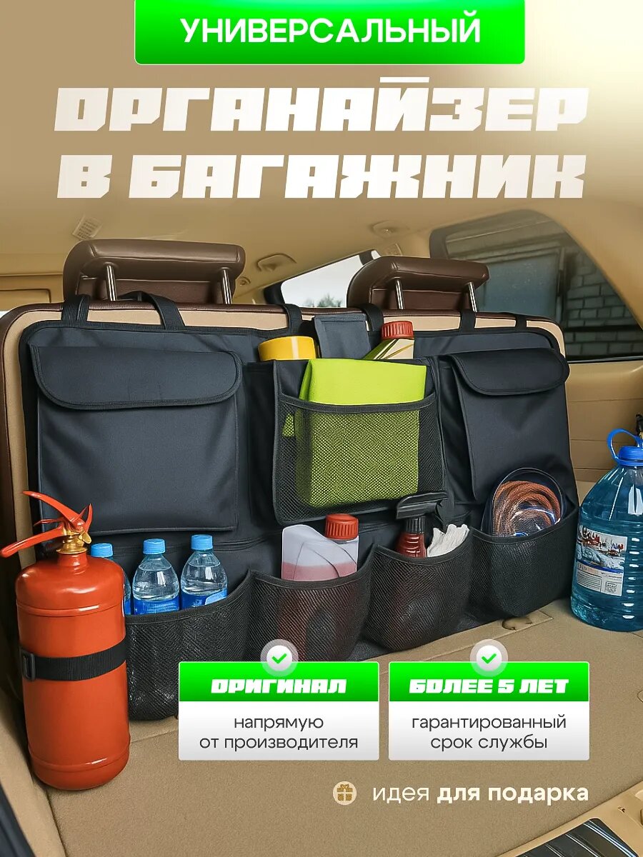 Органайзер из водоотталкивающей ткани Oxford 600D крепится на спинку заднего сидения. Множество карманов для инструментов, мелочей и автотоваров. Есть длинный карман 100 см для габаритных предметов.