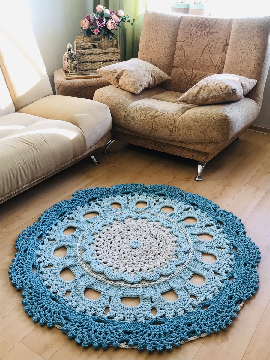 Коврик из полиэфирного шнура 5мм, диаметр получился 1м 30см. Сначала связала основу, отпарила ее, высушила. Потом довязала рельефные элементы и подложку, опять отпарила. Есть сомнения по поводу того, дружат ли сложный узор и такое многоцветье... Но все обсуждалось и согласовано. Могу повторить что-то подобное на заказ, уж очень нравится эта схема)))