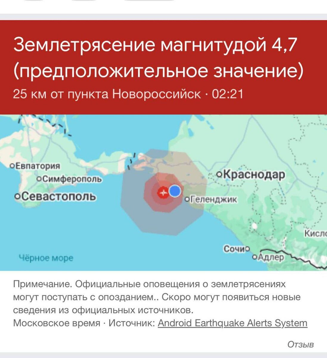 Землетрясение магнитудой 4,7 произошло в 25 км от Новороссийска.