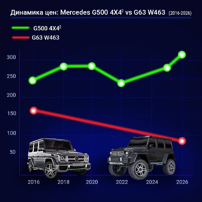 ) Если построить два графика, мы увидим фундаментальную разницу: 1 Линия G63 AMG (Обычный): Напоминает горнолыжный спуск. Купил за 160 тыс евро в 2016-м — сегодня продал за 70 - 80 тысяч (цены на европейском рынке). Это утилитарный предмет роскоши, который стареет. 2 Линия G500 4x4²: Напоминает кардиограмму здорового атлета. После небольшого проседания в 2022 году (когда все побежали за новыми мониторами в салоне), график пошел вверх. Почему к 2026 году цена пошла в рост? • «Цифровая усталость»: Коллекционеры в 2026 году наелись сенсорными экранами. 4x4² — это последний «аналоговый» монстр с портальными мостами и брутальным характером. • Электрификация: На фоне засилья электрических EQG, и охлаждаемых подстаканников в новом G63 настоящий V8 на порталах стал «запретным плодом». Резюме: Посмотрите на эти графики. Обычный Гелик теряет в цене быстрее, чем вылетают пробки от шампанского на презентации новой модели. Но 4x4² — это не машина, это слиток золота, к которому прикрутили коле