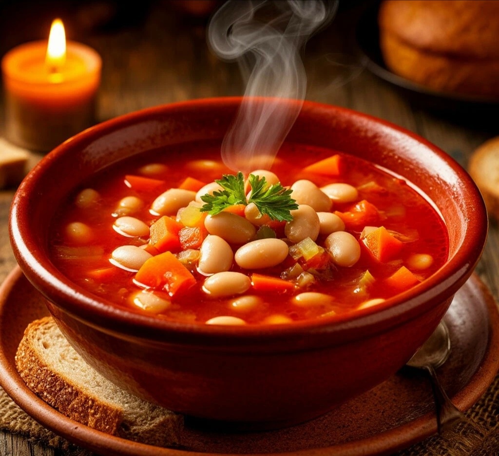 ИНГРЕДИЕНТЫ (на 4-6 порций): 🧾 ·Белая фасоль (сухая) — 300 г (или 2 банки консервированной) 🫘 ·Морковь — 2 шт. 🥕 ·Стебли сельдерея — 2 шт. ·Крупная луковица — 1 шт. 🧅 ·Томатная паста — 100 г (или 400 г свежих томатов) 🍅 ·Овощной бульон или вода — 1,5 л ·Оливковое масло — 4-5 ст.л. ·Лавровый лист — 2 шт. ·Соль, свежемолотый чёрный перец — по вкусу