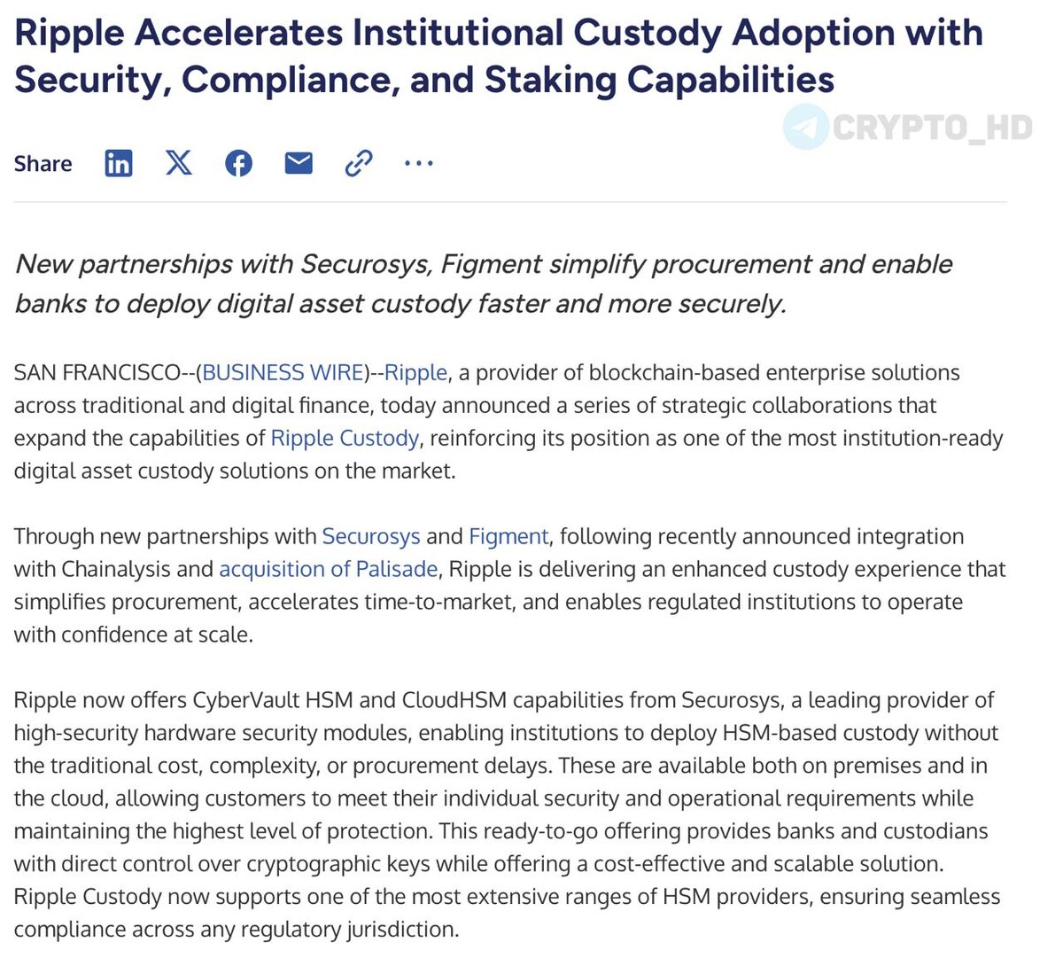 🏦 Ripple расширяет кастодиальную платформу для банков и фондов. Компания заключила партнерства с Securosys и Figment, выстраивая инфраструктуру хранения цифровых активов, соответствующую банковским стандартам и требованиям регулируемых финансовых организаций. Что это дает институционалам: • Хранение цифровых активов и стейкинг без собственных валидаторов. • Безопасное хранение ключей через HSM • Встроенный регуляторный контроль на уровне транзакций. • Стейкинг Ethereum и Solana доступен сразу, без дополнительной настройки и инфраструктуры. Ранее: - токенизация алмазов - токенизация недвижимости - Ripple в ЕС - корпоративные казначейства Crypto Headlines